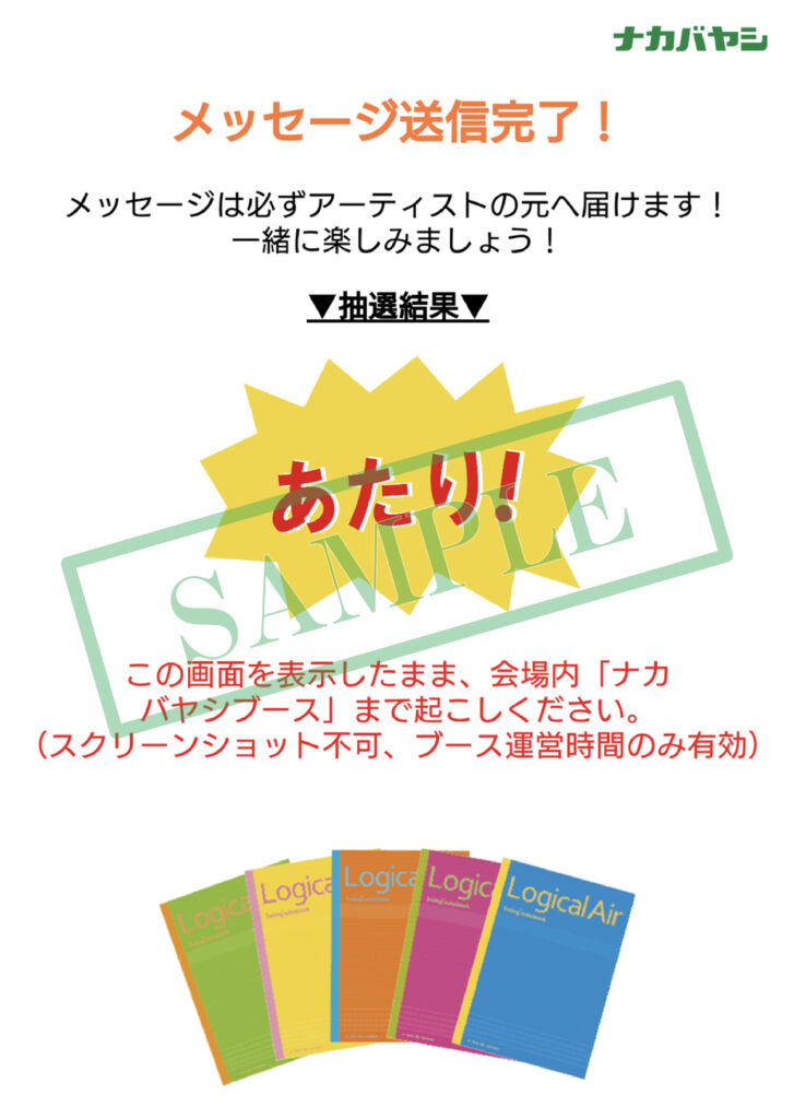 メッセージ送信後、スマホ画面に「あたり」がでたら、ナカバヤシブースへGO!